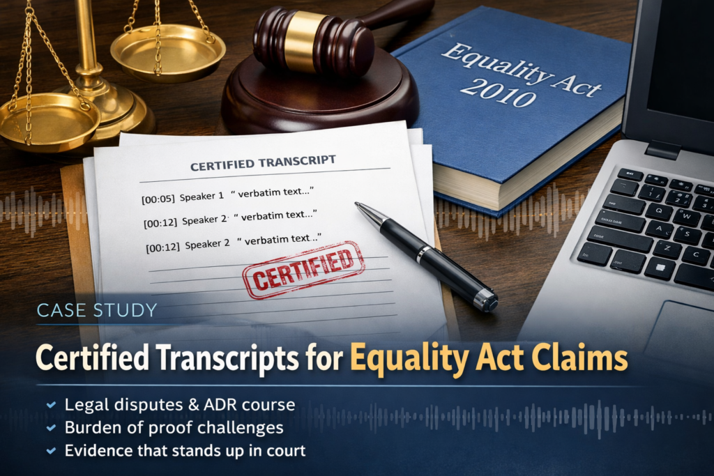 Service: Certified legal transcription (verbatim, time-stamped) – evidence preparation for Equality Act matters (two separate disputes)